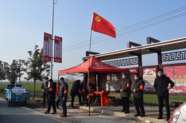 在035县道三王社区西防疫检查站,三王社区党委竖起党旗、组织党员参加疫情防控工作。充分发挥党员先锋作用,认真守好陈桥“西大门”。让党旗在防控疫情斗争第一线高高飘扬。