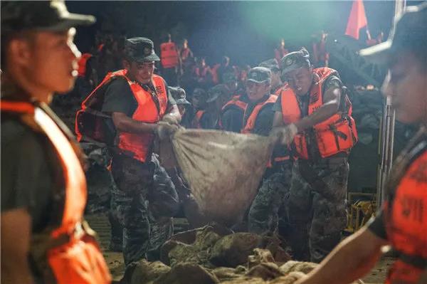 7月26日下午,赶到现场的部队官兵、阜阳民兵开始分批轮流作战,一个个重达几十斤的沙袋,在战士们手中传递接力,现场不时响起的嘹亮军歌,振奋人心。
