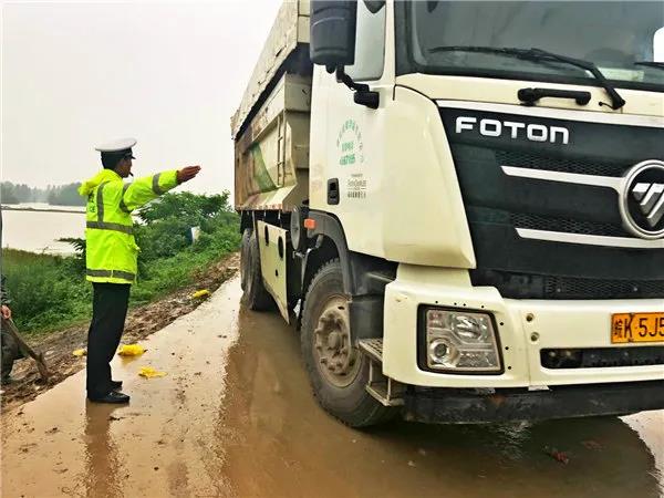 (阜阳交警指挥大型车辆进入抢险现场。阜阳交警供图)
