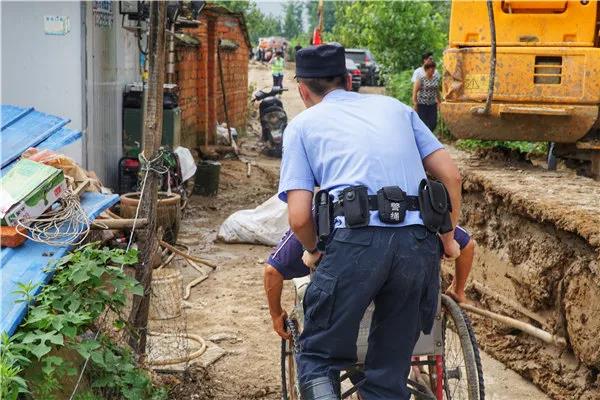 接到撤离的消息,百姓有的冷静,有的不理解,有的不愿舍弃任何一件物品。为了让群众安心转移,颍上县公安局情报指挥中心副主任李先锋带队将群众家万斤粮食扛上二楼,耿棚派出所民警穆畅用雨衣裹住瘫痪的大娘背上车,政工室主任曩道胜跟不愿离家的大爷说:“你不走,我不走!”