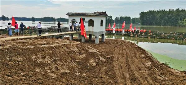 (颍上戴家湖涵闸处,正在水中构筑月牙堤。颍上县防指供图)